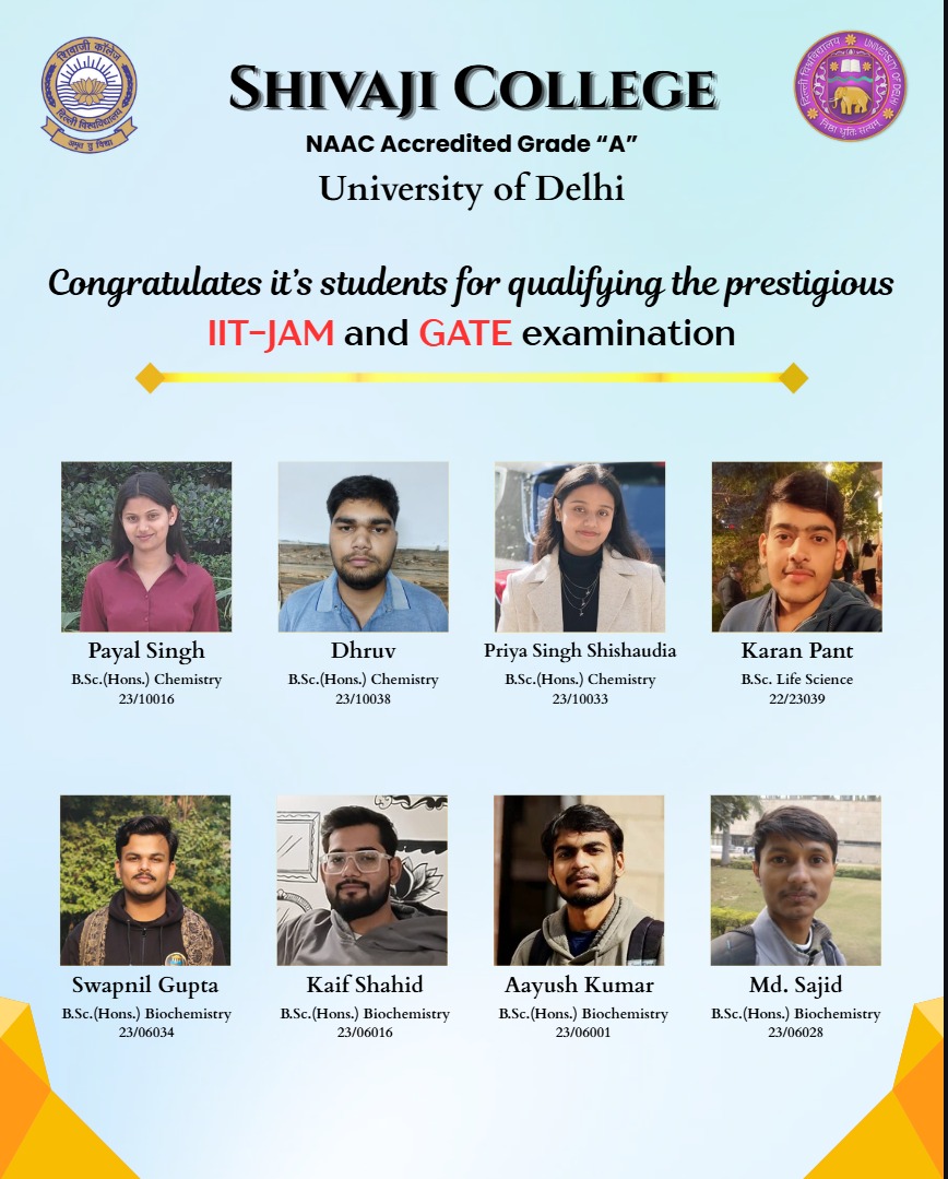 LIST OF ACADEMIC TOPPERS ACADEMIC YEAR: 2024-25 Shivaji College congratulates its student for qualifying IIT- JAM and Gate examination Celebration of 150 years of Vande Mataram: The song that awakened a nation Tele MANAS toll - free Helpline numbers 14416 or 1-800-891-4416 International Conference on Emerging Frontiers in Sustainable, Functional, and Advanced Materials (IC-SFAM 2026) An advisory to Prevention of Defacement of Property Congratulations!! Shivaji College got 8th rank in B.A. in Hindi by India Today - MDRA Rankings 2025 Congratulations!! Shivaji College ranks 23rd (National) & 14th (Delhi) in Commerce, 32nd (National) & 15th (Delhi) in Sciences, and 36th (National) & 16th (Delhi) in Humanities - India Today Rankings 2025.