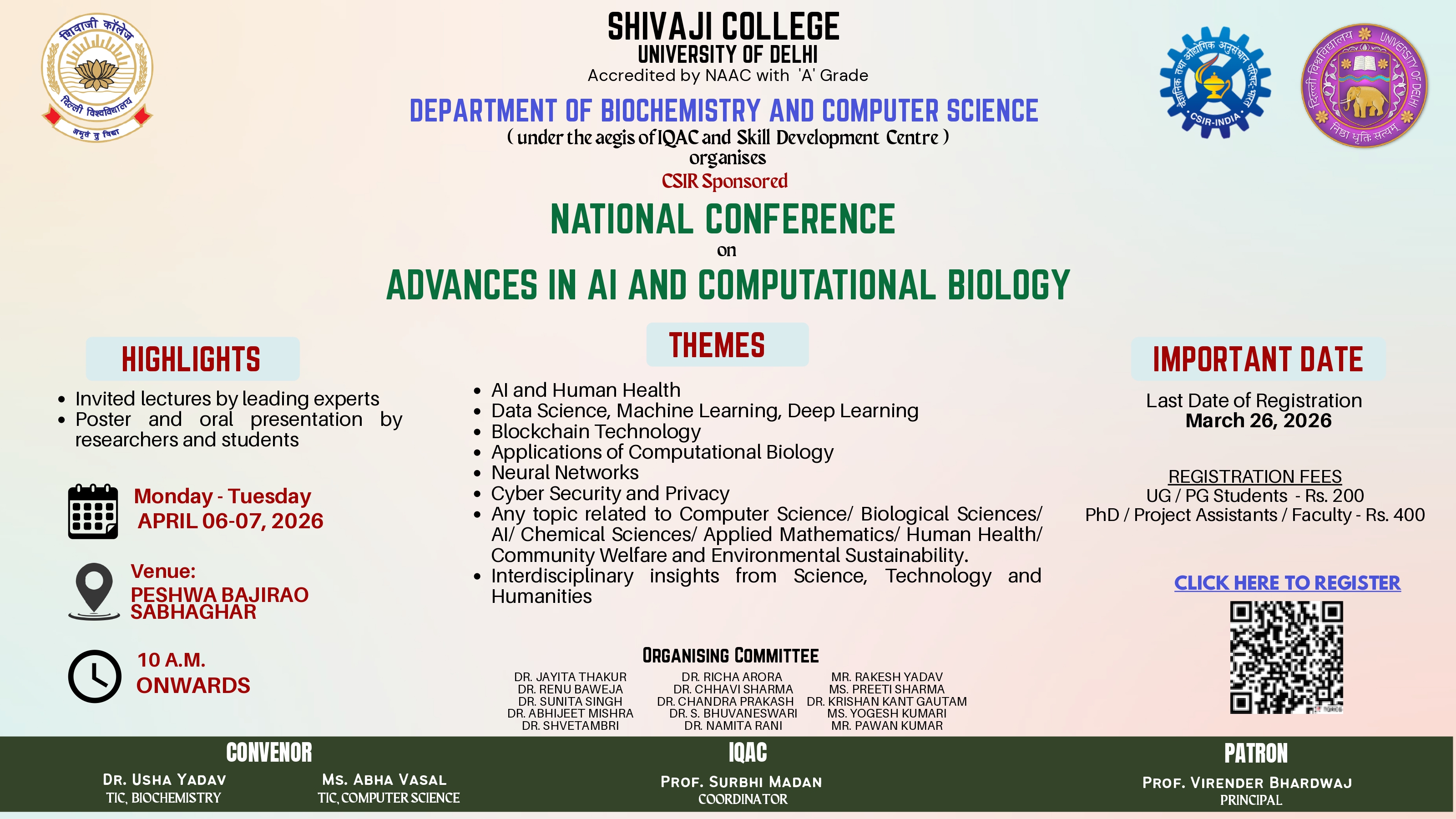 Department of Biochemistry and Computer Science are organizing a CSIR-sponsored National Conference* on Advances in AI and Computational Biology under the aegis of IQAC and Skill Development Centre, on April 06-07, 2026. Conference will include talks by eminent scientists and researchers.. Registration link: view link