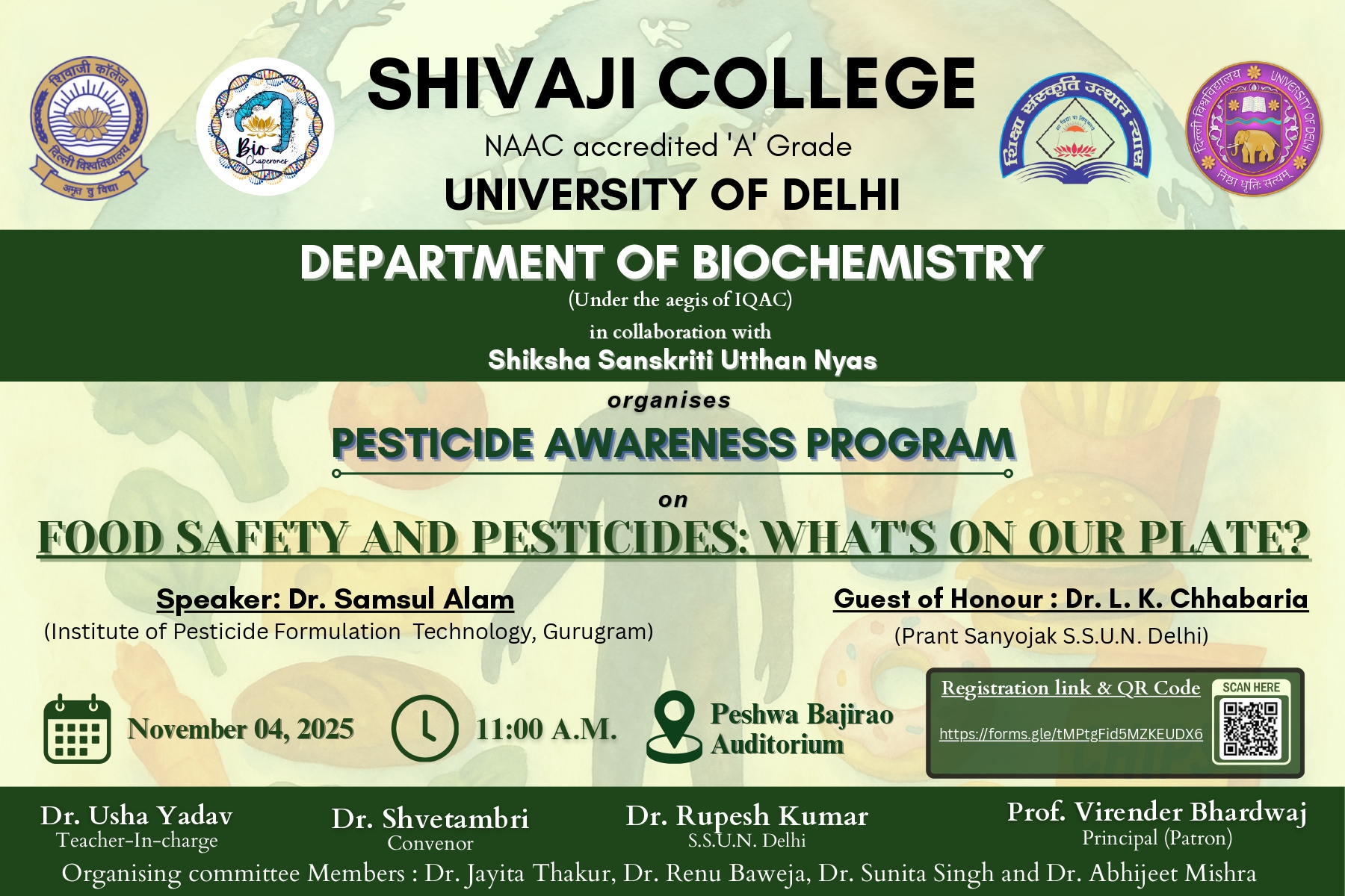 Department of Biochemistry, Shivaji College, University of Delhi in collaboration with Shiksha Sanskriti Utthan Nyas is organizing a Pesticide Awareness Program on 04.11.2025 from 11AM onwards. Venue: Peshwa Bajirao Sabhagar (Jijabai Auditorium 1)